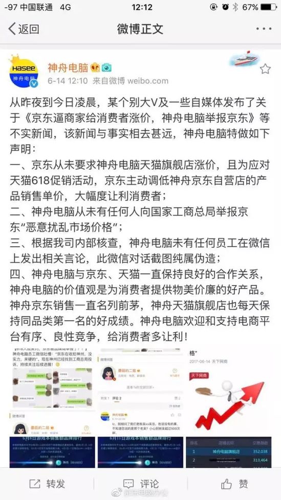二、神舟电脑从未有任何人向国家工商总局举报京东“恶意扰乱市场价格”;