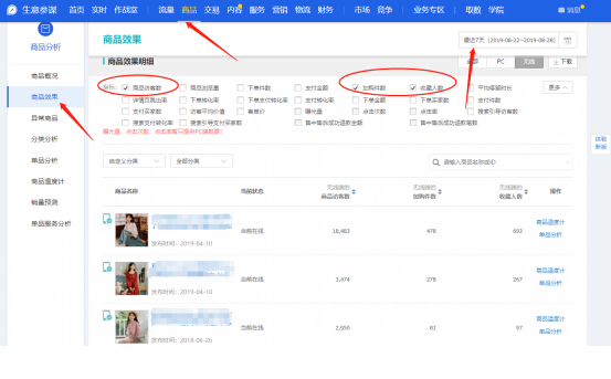 非标品测款,我们可以参考这个宝贝的收藏加购率,一般来说大于收藏加购率10% 的宝贝就是好产品,很容推爆!在生意参谋的商品---返回旧版---商品效果里即可看到。收藏率:收藏数量/访客数