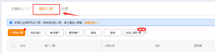 进入直通车后台—新建自定义标准计划—编辑推广内容—找到精选人群—添加人群